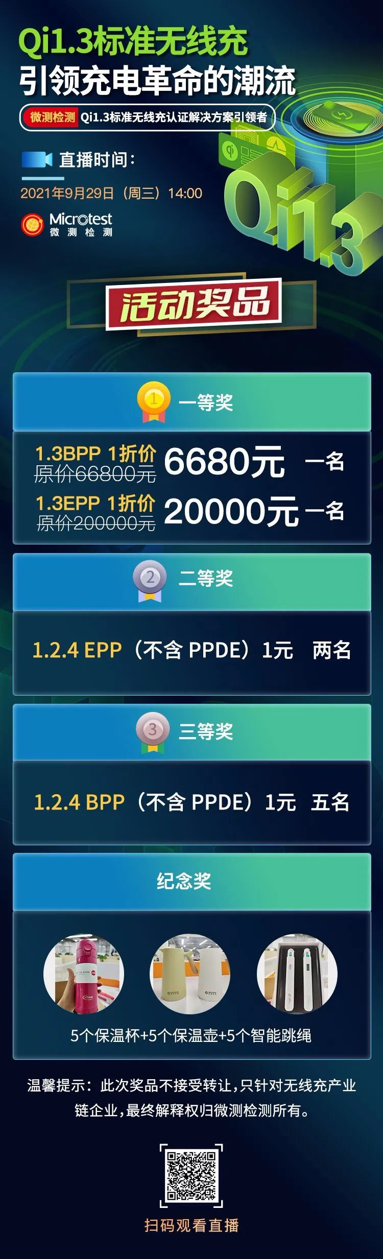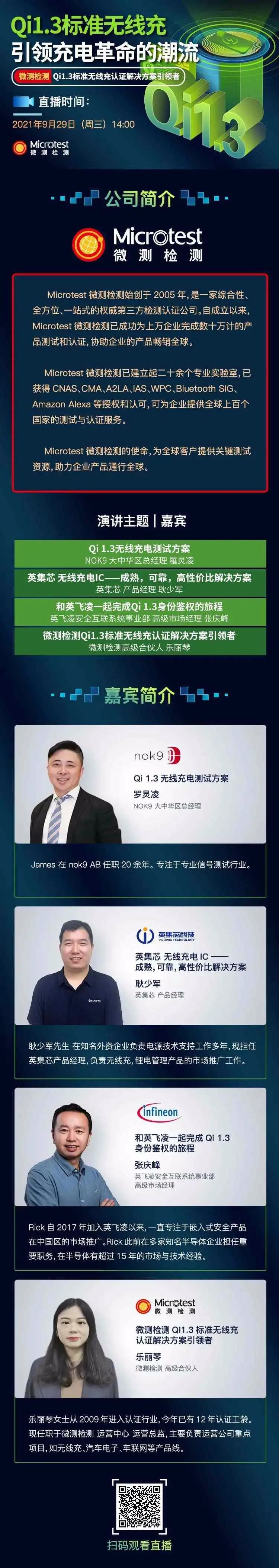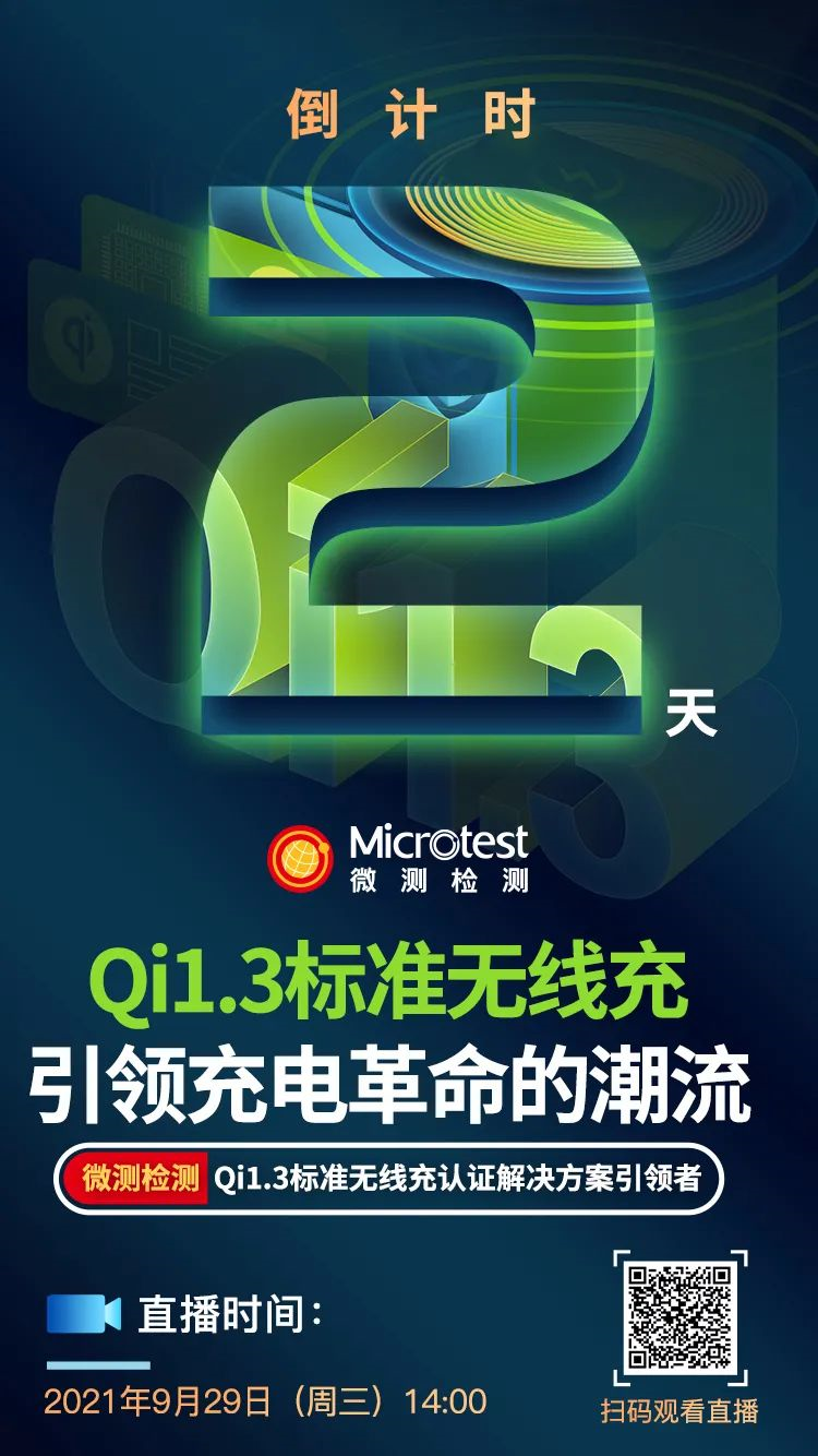 微測檢測將于2021年9月29日14:00進行《Qi1.3標準無線充引領充電革命的潮流》線上直播,直播中有多位嘉賓進行演講,為您介紹Qi 1.3標準的測試、鑒權、解決方案及認證,是無線充電從業者不可或缺的重要直播,趕快預約報名參加吧。