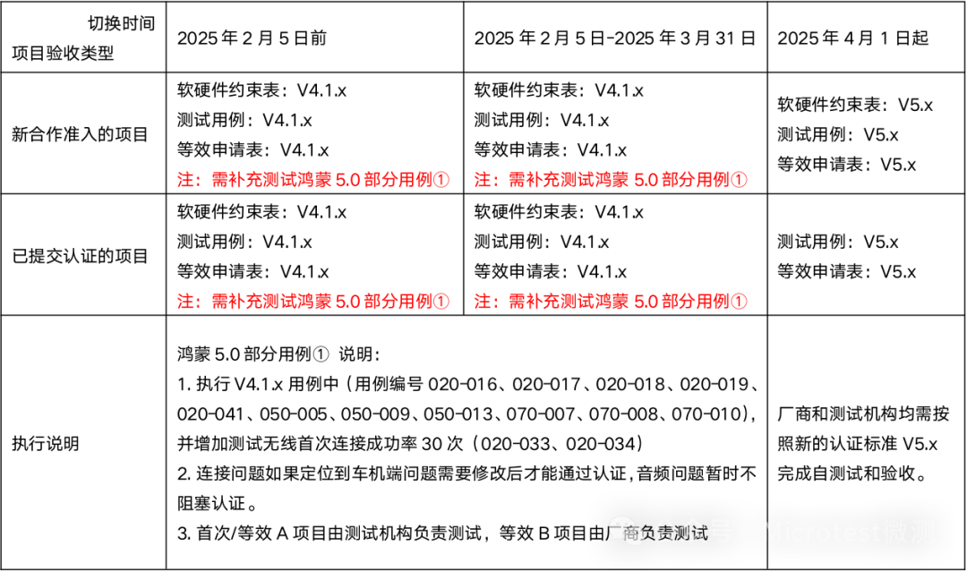2025年2月5日前:沿用V4.1.x版本,需補充測試鴻蒙5.0新增用例(如無線連接、音頻兼容性等)。
