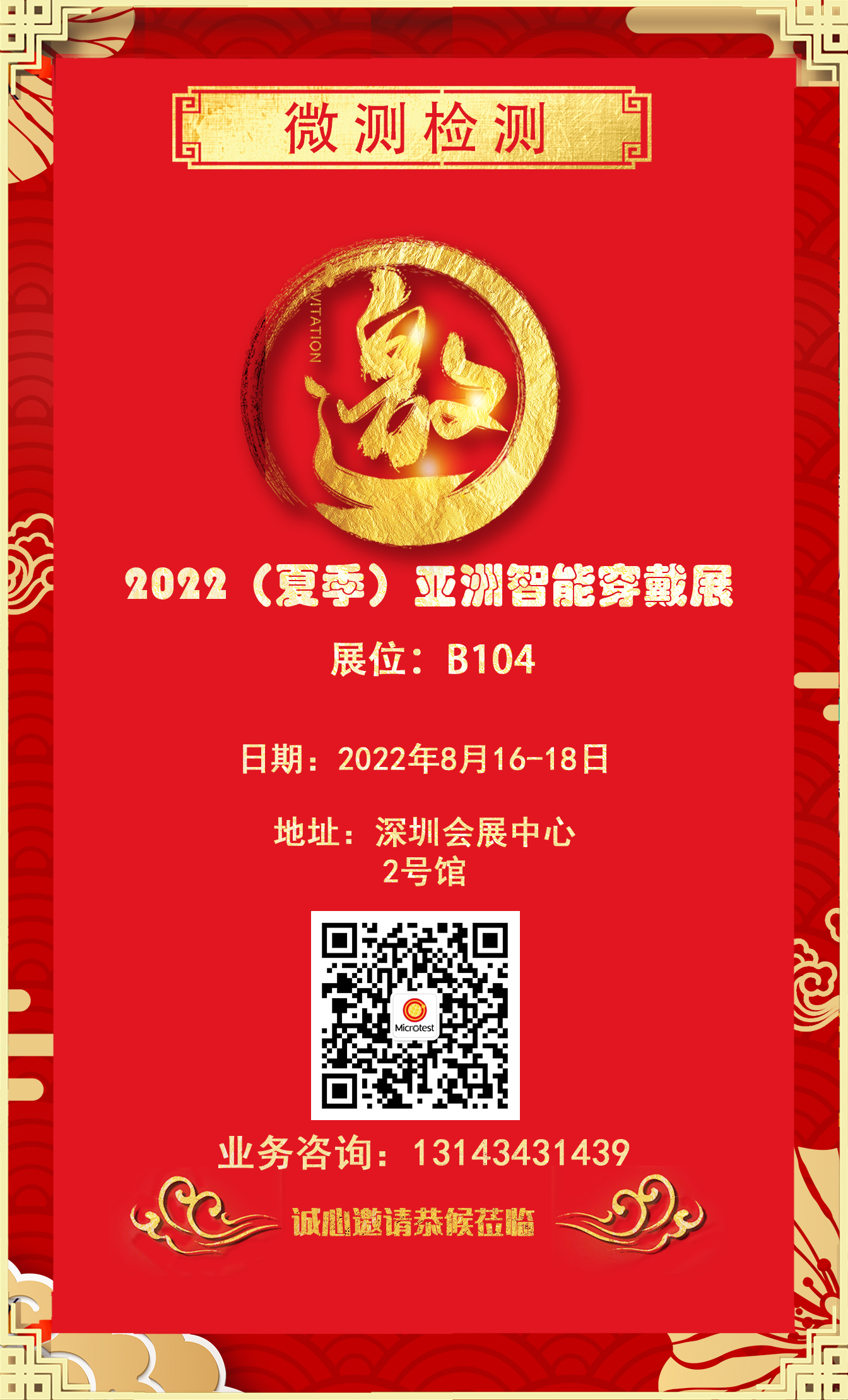 您好!非常感謝大家長期以來對微測檢測的大力支持。2022(夏季)亞洲智能穿戴展即將開展,在此,我們真誠地邀請您蒞臨我司展位參觀指導,恭候您的到來。