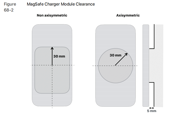 2)對于所有支持的設備方向,從MagSafe充電器模塊表面的中心到設備頂部邊緣不超過30mm;對于任何超過30mm的的配件,與設備背面(配合面)保持5毫米的間隙;