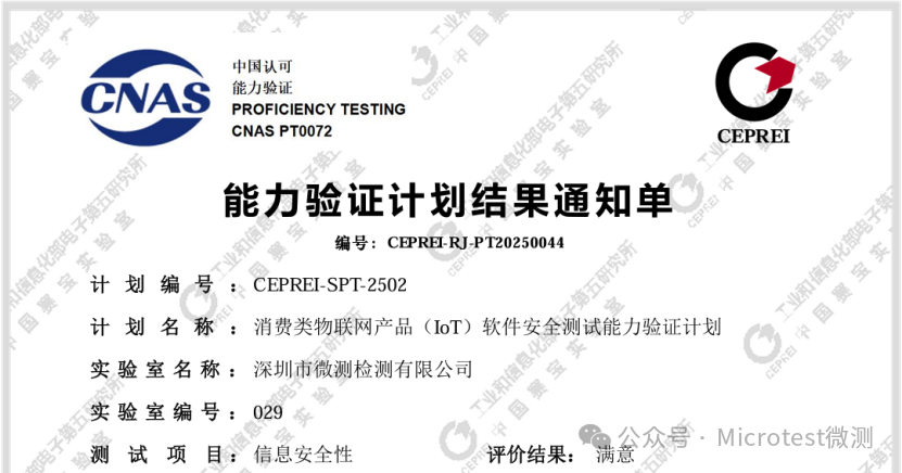 國家級能力驗證認可: 在工業(yè)和信息化部電子第五研究所(中國賽寶實驗室)組織的“消費類物聯(lián)網產品(IoT)軟件安全測試”能力驗證計劃中,Microtest微測檢測表現(xiàn)優(yōu)異,獲得“能力驗證結果滿意通知書”。這進一步印證了其網絡安全技術實力在國內頂尖權威機構層面的充分肯定。