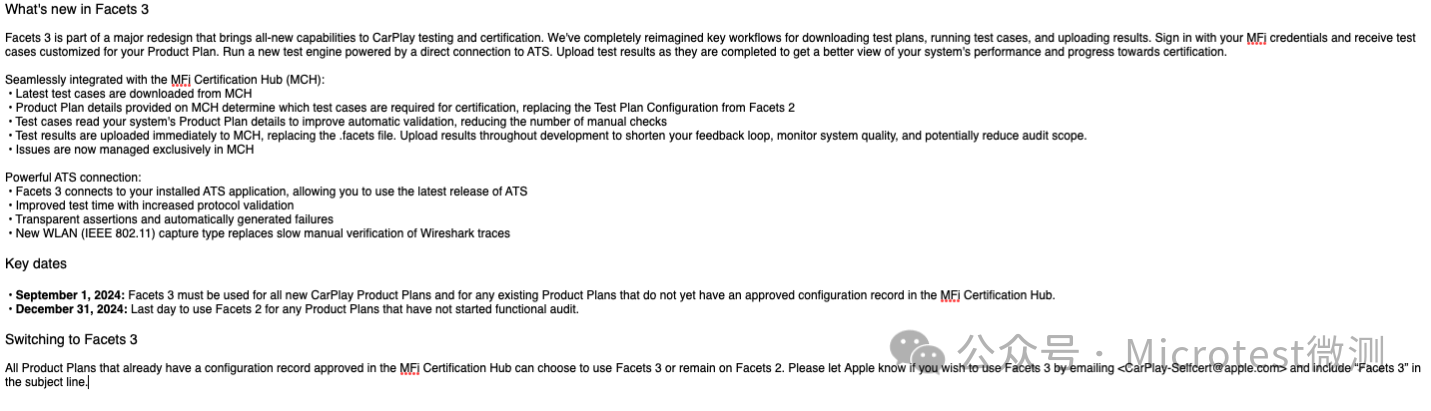 從2023年8月Facets 3就已經開始進行試點測試使用。Facets 3是一項重大重新設計的一部分,該設計為CarPlay測試和認證帶來了全新的功能。使用MFi會員賬號登陸Facets 3,Facets 3會根據產品計劃以及產品配置表生成測試用例。通過與ATS直接連接運行測試。完成測試后上傳測試結果,Apple可以從MCH網站去了解產品系統的性能和認證進展。