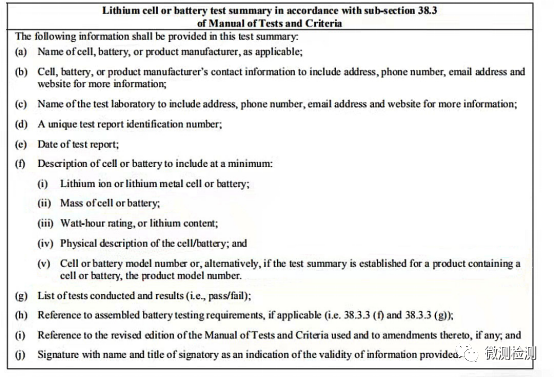 關(guān)于鋰電池檢測(cè)的第38.3章節(jié)的部分內(nèi)容修訂有兩處: "i驗(yàn)概要Lithium cell and battery testsummary" 中: 38.3.5()(i)原"質(zhì)量(Mass) "更改為“電池或電池組質(zhì)量(Mass of cell orbattery) ";