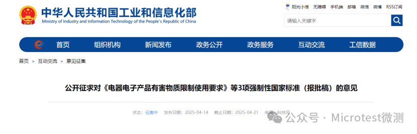 2025年4月14日,中華人民共和國工業和信息化部網站發布公告:根據國家標準委下達的強制性國家標準制修訂計劃,工業和信息化部組織完成了《電器電子產品有害物質限制使用要求》等3項強制性國家標準(報批稿)的編制工作。為進一步聽取社會各界意見,現對標準報批稿及編制說明(見附件1、2)予以公示,截止日期2025年4月21日。