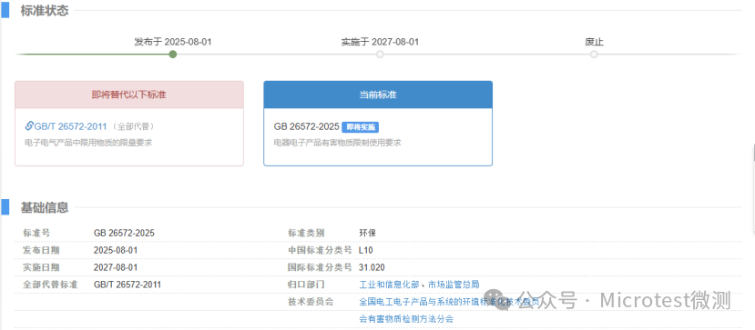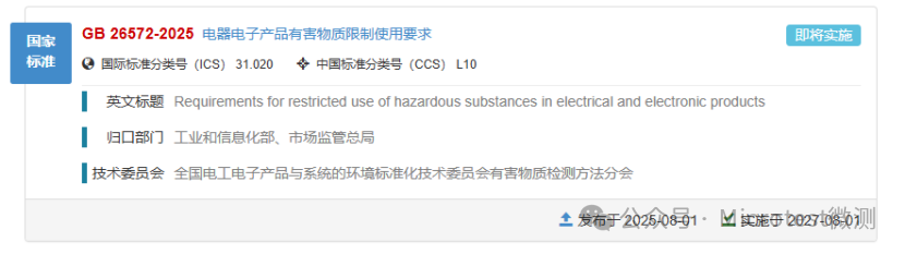 2025年8月1日,國家標準《電器電子產品有害物質限制使用要求》GB26572-2025正式發布,標準將于2027年8月1日正式實施,并全面替代推薦性舊標準GB/T 26572-2011,這標志著中國RoHS正式成為強制性國家標準,對我國電器電子行業的可持續發展和綠色轉型具有重要意義。