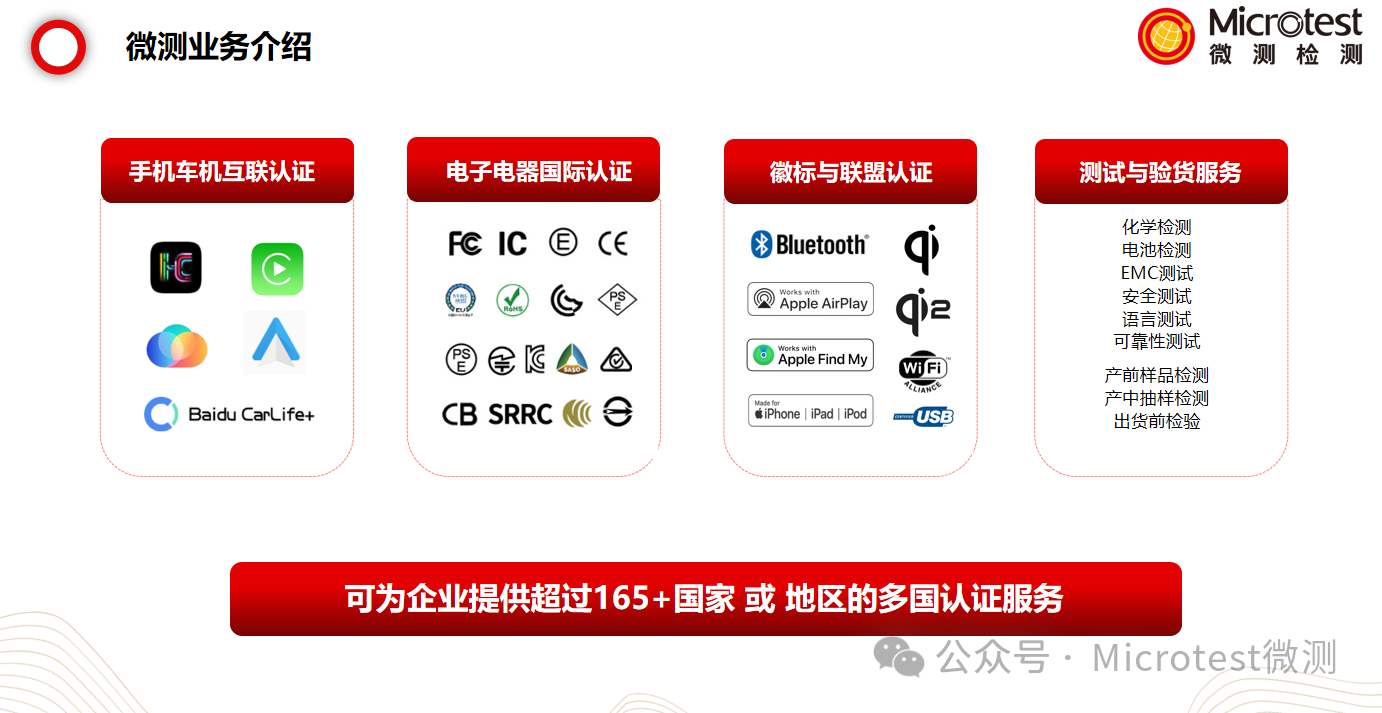 一站式:微測檢測已建立起二十余個專業實驗室,企業通過微測檢測就可以獲得一站式的測試與認證解決方案;(EMC、RF、MFi、BQB、Qi、USB、安全、鋰電池、快充、汽車電子EMC、汽車手機互聯、語音通話質量)