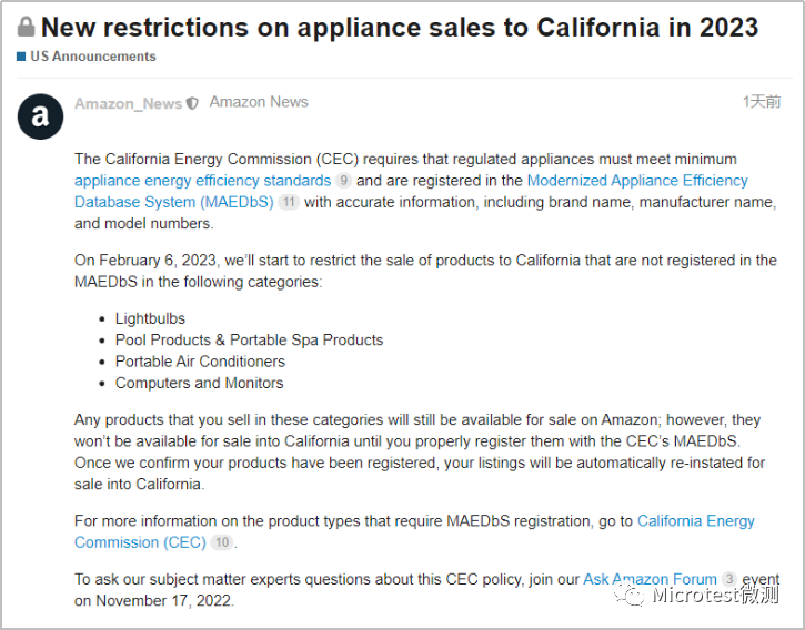 以上必須滿足CEC Title20電器能效標(biāo)準(zhǔn)要求,并在CEC能效數(shù)據(jù)庫系統(tǒng)(MAEDbS)中注冊(cè)列名,注冊(cè)信息包括品牌名稱、制造商名稱和型號(hào)等。也就是說以上品類必須滿足CEC Title 20 能效認(rèn)證,并在CEC 能效數(shù)據(jù)庫系統(tǒng)(MAEDbS)中注冊(cè)。如無CEC MAEDbS注冊(cè)的將無法在加州銷售,一旦賣家完成MAEDbS注冊(cè)將自動(dòng)恢復(fù)銷售。