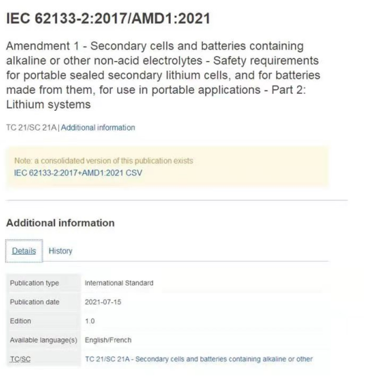 2021年07月15日,IEC網站公布了IEC62133-2:2017標準的升級版,即2021版。