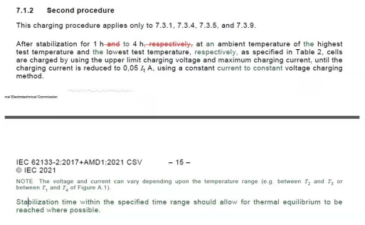 1、更新后的標準修正了7.1.2 章節中關于電芯恒溫充電的擱置時間,將擱置時間由1h and 4h respectively 修正為1h to 4h,充電方式由恒壓修正為先恒流充電再恒壓充電。