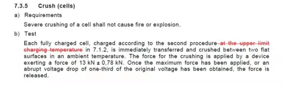 2、7.3.5章節擠壓測試,更新后的標準刪除了原標準中上限充電溫度的描述, 新標準明確了上、下限充電溫度都需要測試。