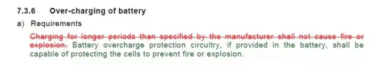 3、7.3.6章節過充測試,修正測試要求的描述為:如果電池中帶有充電保護電路,應該能夠保護電芯防止起火或爆炸。