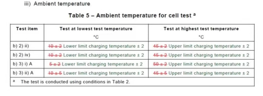 1. 4、7.3.9章節強制內部短路測試,修正了測試溫度的描述,由原來的10℃/45℃修改為按照制造商宣稱的充電溫度下限/上限來處理。
