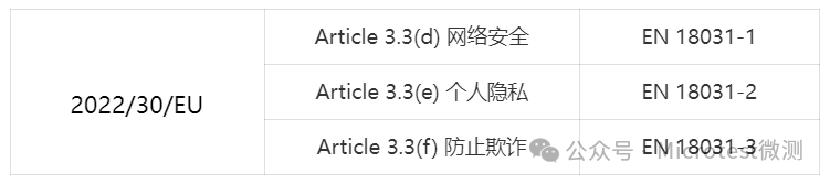 EN 18031系列標準包含EN 18031-1, EN 18031-2和EN 18031-3三個標準,分別對應的RED指令3.3d, e, f提出的三個網絡安全方面的要求。2025年1月28日,該系列標準已被歐盟委員會采納為協調標準。