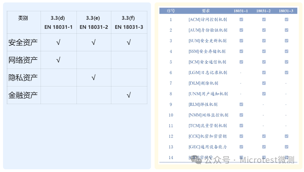 EN 18031系列標準將評估項目分為了四類資產:安全資產、網絡資產、隱私資產和金融資產,每類資產對照不同的安全機制要求(共計14大項)。