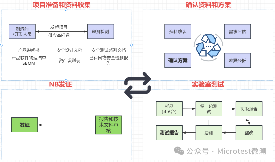 EN 18031標準測試總共分為4個過程,項目準備和資料收集 -> 確認資料和方案 -> 測試 -> 發證(如需)